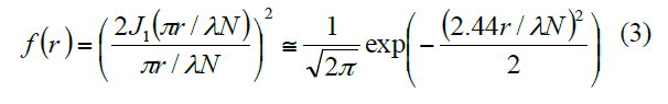 我們正在測量一個比距離 D 小的器件寬度。因此,這是一個亞衍射極限特征。這個系數(shù)來自于從點源發(fā)出的能量譜作為距離的函數(shù)。圖6中的艾里盤確定了能量譜在貝塞爾函數(shù)輪廓中為零的距離極限,這是以點源為中心的距離函數(shù) [9]。這個能量輪廓在艾里盤內(nèi)可以用高斯輪廓近似擬合,其系數(shù)為 2.44,這便于進一步的數(shù)學(xué)處理。從點源沿距離的能量譜可以描述為: